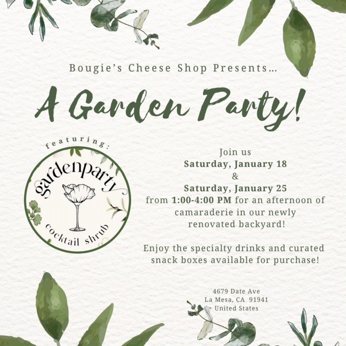 GARDEN PARTY AT BOUGIE’S CHEESE SHOP IN LA MESA JANUARY 18 AND 25