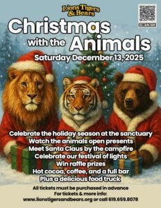 Printer-friendly versionEast County News Service Nov. 18, 2025 (Alpine) — Lions Tigers & Bears, San Diego County’s lone accredited animal sanctuary is getting ready for the winter holidays. The nonprofit organization is holding Christmas with the Animals Fundraiser in December at its 142-acre site in Alpine. The event will include gift-giving, holiday lights and music, and will support