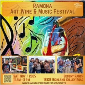Printer-friendly versionEast County News Service Oct. 15, 2025 (Ramona) — The 13th annual Ramona Art, Wine & Music Festival is heading to the Begent Ranch in Ramona on Saturday, Nov. 1. The popular event, set from 11 a.m. until 5 p.m. at the ranch at 18528 Highland Valley Road, will include wines and craft beverage tastings, all-day live
