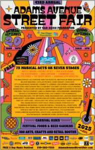 Printer-friendly versionEast County News Service Sept. 18, 2025 (San Diego) — The free two-day Adams Avenue Street Fair, considered San Diego’s favorite music festival, and attended by more than 50,000 people in Normal Heights, is happening this weekend, Saturday, Sept. 20 and Sunday, Sept. 21. Presented by San Diego Foundation, the 43rd annual Adams Avenue Street Fair features 75 musical