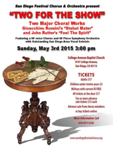 Printer-friendly version East County News Service April 5, 2015 (San Diego) – The San Diego Festival Chorus and Orchestra will present “Two for the Show” on Sunday, May 3rd at 3 p.m. at College Avenue Baptist Church (4747 College Avenue, San Diego). The concert features two major choral works: Gioacchino Rossini’s “Stabat Mater” and John Rutter’s “Feel the