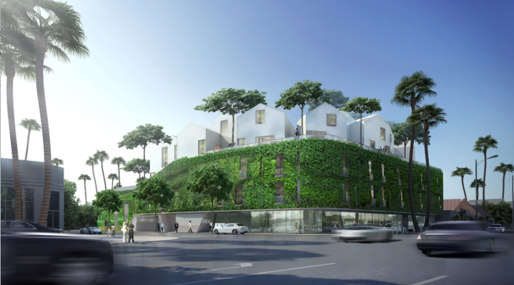 My personal favorite is at the top of this page. An 18 unit “village” sits on top of the water-efficient living green wall of native and drought-tolerant succulents and vines at 8600 Wilshire in Beverly Hills. It consists of condos, townhouses and villas clustered around a spacious central courtyard.
