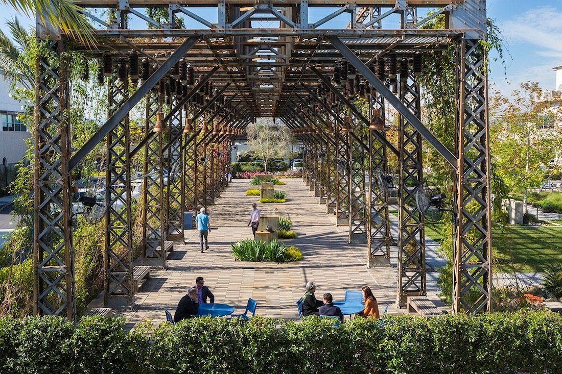 A a decommissioned electrical substation trellis has been incorporated into the Centennial Courtyard of Burbank Water and Power EcoCampus. There are three rooftop gardens, to help reduce heat and channel stormwater, on the Administration Building. A variety of stormwater capture technologies throughout the campus provide the sole source of water for the landscaping.