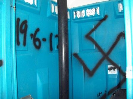 On August 20, 2009, at about 2300 hours, the Vista Fire Department responded to a fire at the same fenced yard at the park. Two vehicles and part of an out building were engulfed in flames. The same type of hate/racist graffiti was discovered on a building inside the yard. The fire was determined to be arson and caused about $50,000 worth of damage.