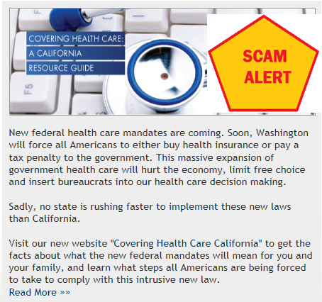 December 3, 2013 (San Diego)—The California Assembly Republican Caucus, chaired by East County representative Brian Jones (R-Santee), is taking heat for creating a phony website (http://www.coveringhealthcareca.com/) designed to divert consumers from the state’s official Covered California site (https://www.coveredca.com/).