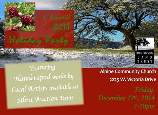 December 10, 2014 (San Diego’s East County) – Celebrate the holiday season with an artist reception, gallery viewing, and silent auction! featuring handcrafted works by local artists—all to benefit Back Country Land Trust and our local arts community. The event will be held on Friday, Dec. 12 from 7-10 p.m. at the Alpine Community Church, fuller Hall (2225 West Victoria Drive, Alpine).  A suggested $10 donation includes homemade appetizers & desserts, and hosted beer, wine, and holiday speciality drinks.  All artwork & handcrafts will be available for silent auction bidding.