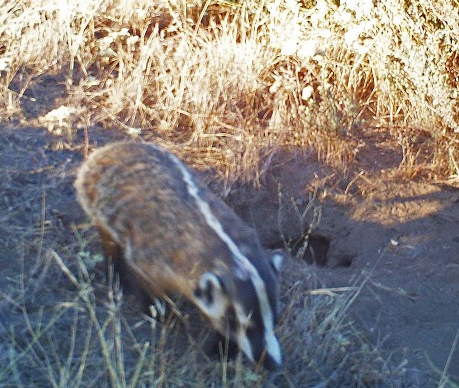 As they approached the burrow, things looked promising. The loose, sandy soil was well-covered with wild grasses, dry and swaying in the wind. Numerous small burrows betrayed the presence of the rodents that make up the diet of the American badger. When the suspect hole came into view, Brehme knew they were on to something. Closer inspection revealed tell-tale horizontal claw marks on the wall of the tunnel, and the recent presence of a badger was confirmed.