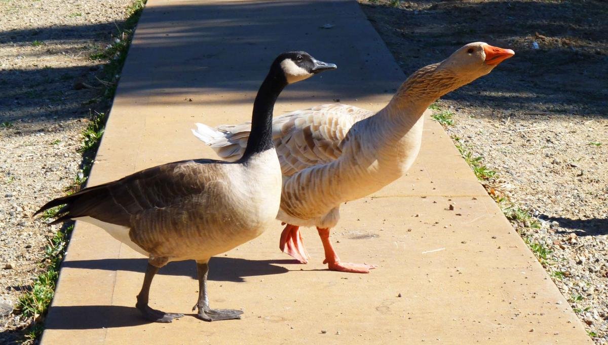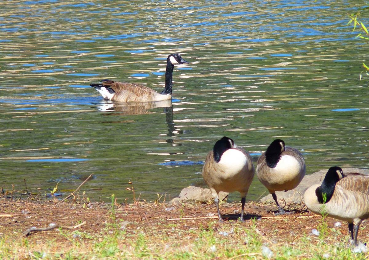 A flock of Canada geese, migrating south for the winter, has taken up residence on the south shore of the lake–mingling with other geese in a noisy cacaphony of sound. View video of a gaggle of noisy geese taking a stroll.