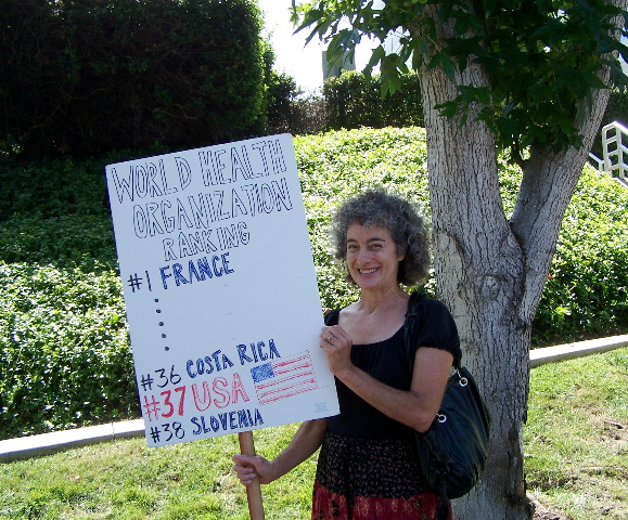 Marcia Bookstein carried a sign noting that the World Health Organization ranked the United States as 37th in the world – just ahead of Slovenia.