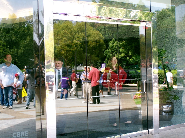After a delegation of activist entered the offices to present their demands to the insurance company’s management, security and company officials denied further entrance and glared at the protestors from behind the glass doors.