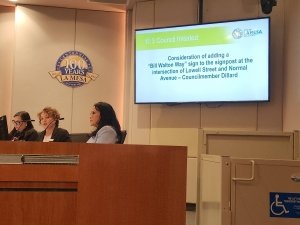 In photo, below right, La Mesa City Councilwoman Laura Lothian (center), speaks about the genesis of the “Bill Walton Way” sign coming to the intersection of Lowell Street and Normal Avenue near Helix High School. City councilmember Patricia Dillard (right) had asked for the street sign designation to be placed on the Tuesday, April 14 city council agenda.Lothian said it was important for the city council to acknowledge that the initial idea for a street designation named after Walton was originally proposed by Harris.