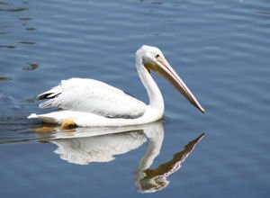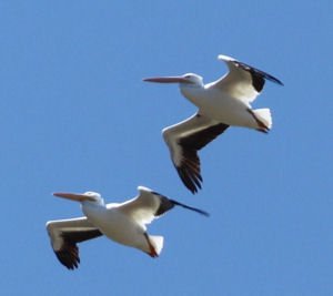 There is good reason for this. It winters along the coast but only breeds inland throughout the county’s lakes! Another distinct difference between the Brown Pelican of the coast and the American White Pelican is their fishing skills and techniques. The American White Pelican does not dive for fish as the Brown Pelican does. Instead, it dips its head underwater to scoop up fish. Several pelicans may fish cooperatively, moving into a circle to gather fish into a group and then dipping their heads under simultaneously to catch fish.