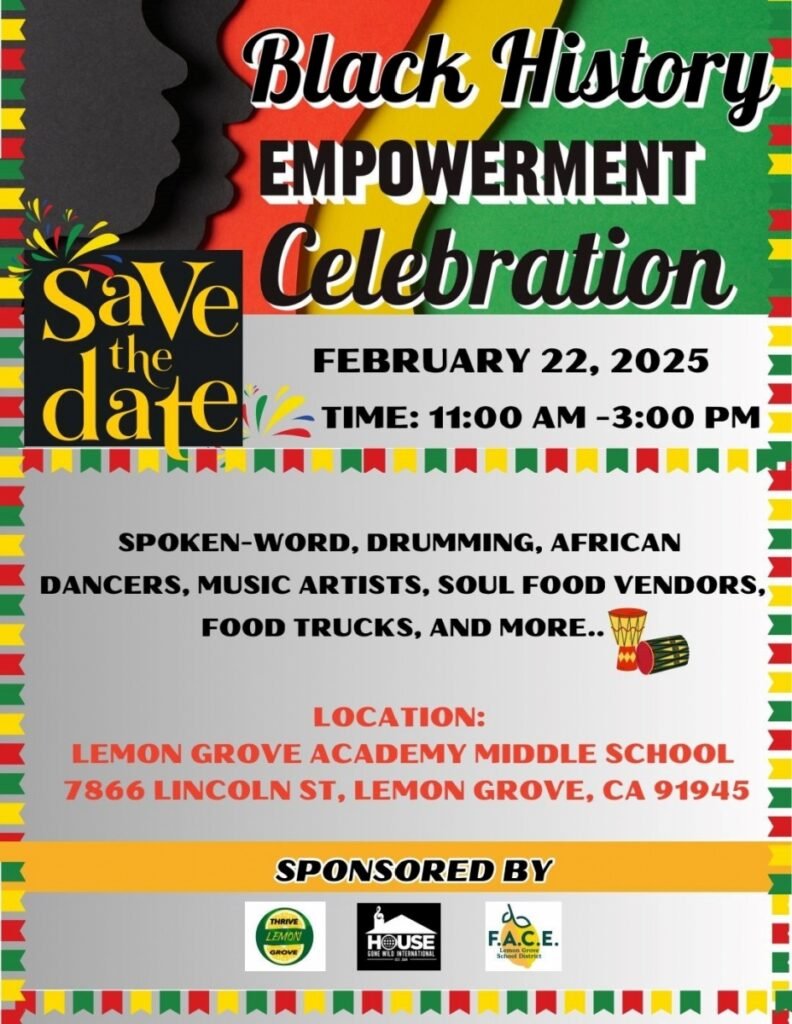 January 31, 2025 (Lemon Grove) – A Black History Empowerment Celebration will be held on February 22 from 11 a.m. to 3 p.m. at Lemon Grove Academy Middle School, 7866 Lincoln St. in Lemon Grove.  Festivities will include spoken word, drumming African dancers, music artists, soul food vendors, food trucks and more.