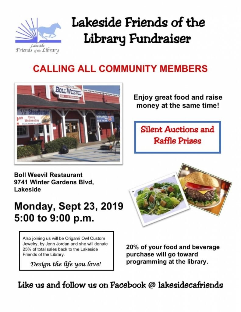 September 20, 2019 (Lakeside) – Lakeside Friends of the Library invites you to a fundraiser on Monday, Sept. 23 from 5 p.m. to 9 p.m. at the Boll Weevil Restaurant at 9741 Winter Gardens Blvd.