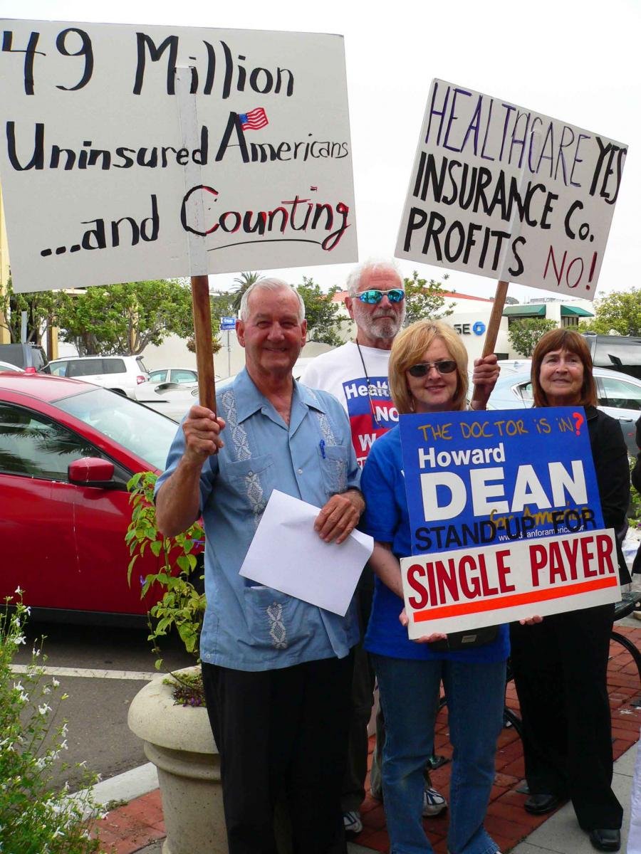 Demonstrators who support a single-payer system that would mandate government healthcare for all spoke with Dean during his San Diego appearance. Floyd Morrow, former San Diego Mayoral candidate, presented Dean with a petition calling for adoption of a single-payer healthcare system (photos). (Editor’s note: Unlike some recent townhall forums, Dean’s appearance did not attract any anti-healthcare reform protestors.)