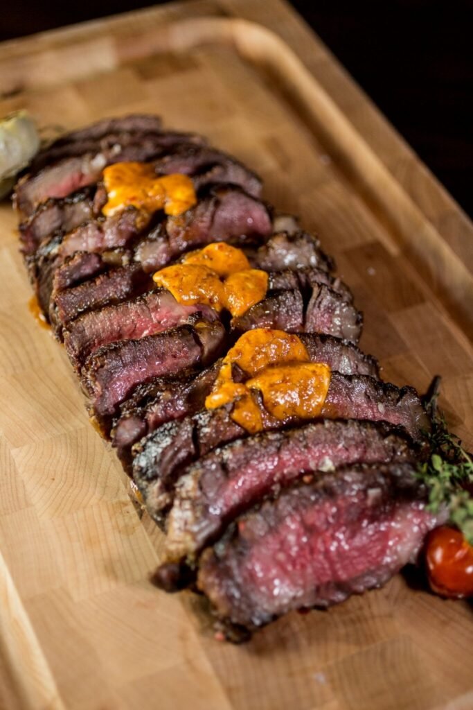 The Bull and Bourbon steakhouse features steaks cooked on a wood-fired Santa Maria grill. The restaurant has its ownbeef dry-aging room, complimented by single-barrel and other high-end bourbons.