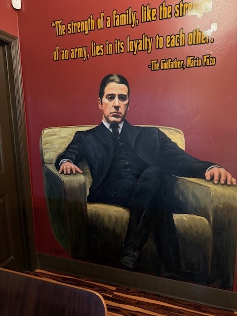 I was tempted to try all the slices displayed in the glass case, which included pizzas with mobster-themed titles (The Don, Luca Brasi, and Mob Ties) tying in with artwork depicting Godfather movie images and quotes on red walls.
