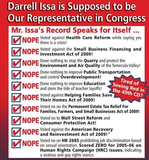 He faults Issa for opposing numerous consumer protection measures and other measures such as equal pay and freedom of choice for women. “Check his record on www.vote-smart.org which gives you every vote that Mr. Issa has ever made in Congress. Most of his votes are no.”