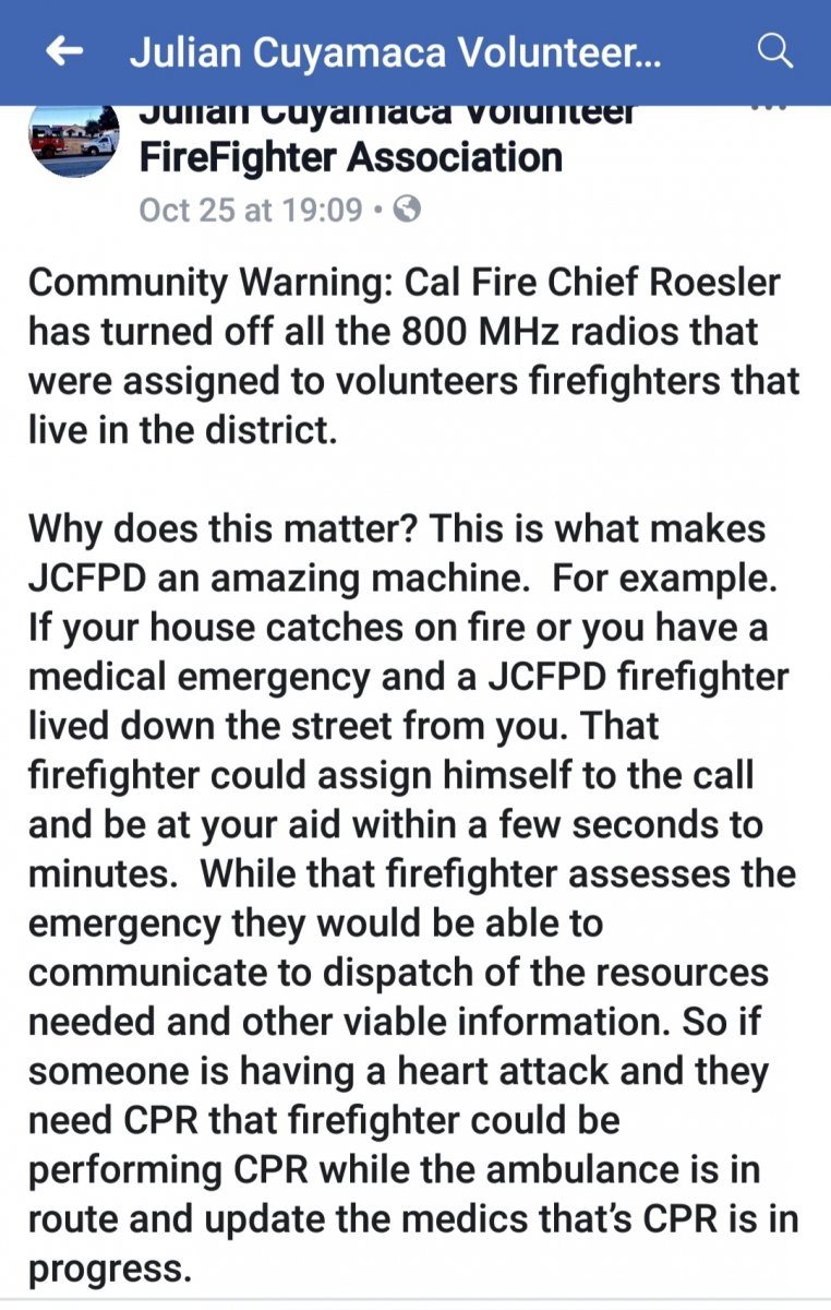 A statement (photo, left) from the Julian Cuyamaca Volunteer Firefighter Association (JCVFA) published on Facebook on Oct. 25 says, “Why does this matter? This is what makes JCFPD an amazing machine. For example, if your house catches on fire or you have a medical emergency and a JCFPD firefighter lives down from the street from that, that firefighters could assign himself to the call and be at your aid within a few seconds to minutes. While that firefighter assesses the emergency they would be able to communicate to dispatch the resources needed and other viable information.”