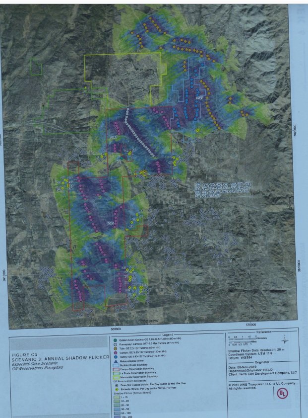 Tisdale has submitted comments voicing concern that among other issues, acoustical studies on potential noise and infrastructure impacts of the project relied on smaller wind turbines than the goliath turbines set to be built at Campo Wind– larger than any ever built on land, according to Tisdale. She contends the local residents will be “guinea pigs” subjected to dangerous conditions.