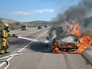 January 31, 2010 (Alpine) – Firefighters from Viejas and the U.S. Forest service responded to a vehicle fire on Interstate 8 in Alpine this afternoon. Alpine firefighter/paramedics Broc Thorn and Colby Ross formed an attack line and quickly knocked down the fire before it spread into the nearby vegetation.