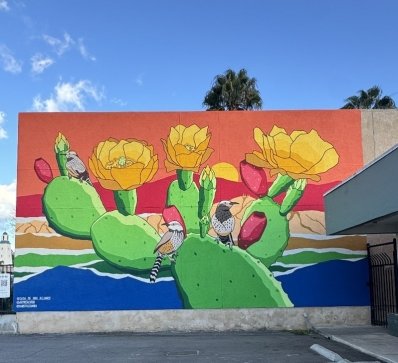 Three cactus wrens, representing community, belonging, and togetherness, perch among the cactus pads, while the rolling hills and soft morning skies of Casa de Oro anchor the mural in its surrounding landscape. Bright, uplifting colors inspired by local nature reflect both place and pride.