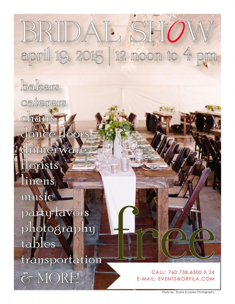 Printer-friendly version April 15, 2015 (San Pasqual)—Looking for ideas, tips and information to plan your wedding? Orfila Vineyards invites you to a free bridal show on April 19th from