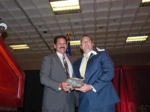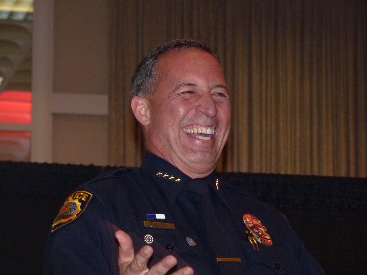La Mesa Chamber president Mary England also presented a special award to retiring La Mesa Police Chief Ed Aceves, who received a standing ovation, plus flowers for his wife.
