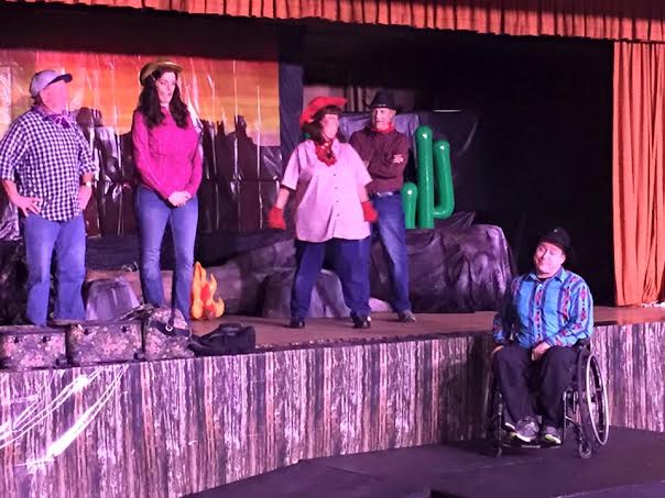 This past weekend The Players presented Wrangle at Red Mountain Ranch by Nancy Bond, directed by Joel Gossett. This was a real hootenanny. For this show you were invited to wear your western duds.You sat at long picnic tables with red checked tablecloths, bowls of chips and salsa, pitchers of .lemonade and water. Little pails held the silverware, ballots, and a cowboy themed word scramble to add to the fun.