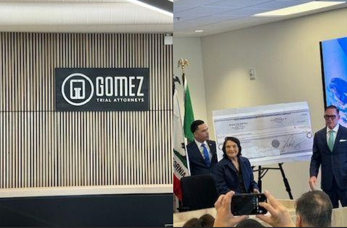 Photos: Left: the outside plaque of Gomez Trial Attorneys. Right: Dolores Huerta is awarded a check of $10,000.