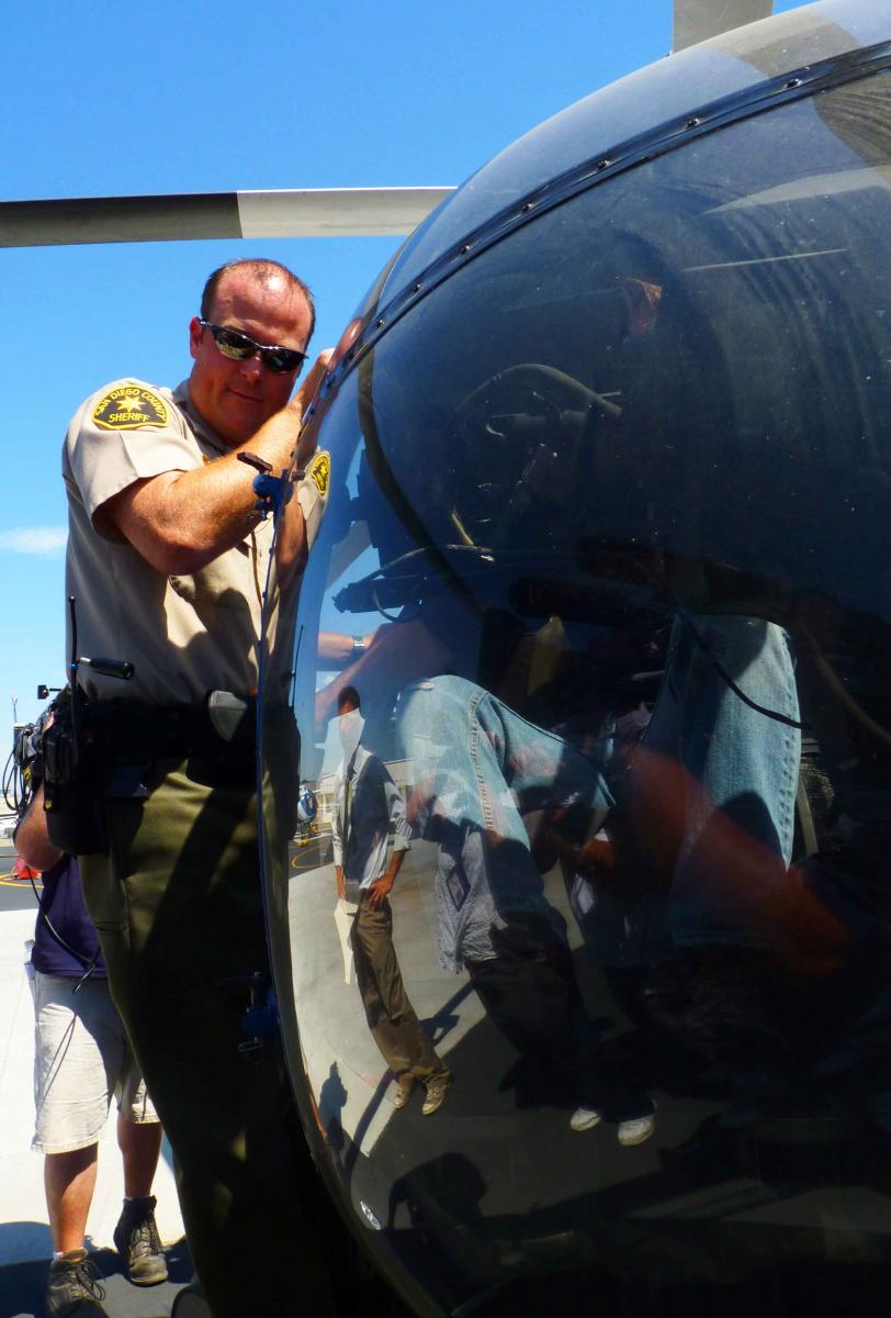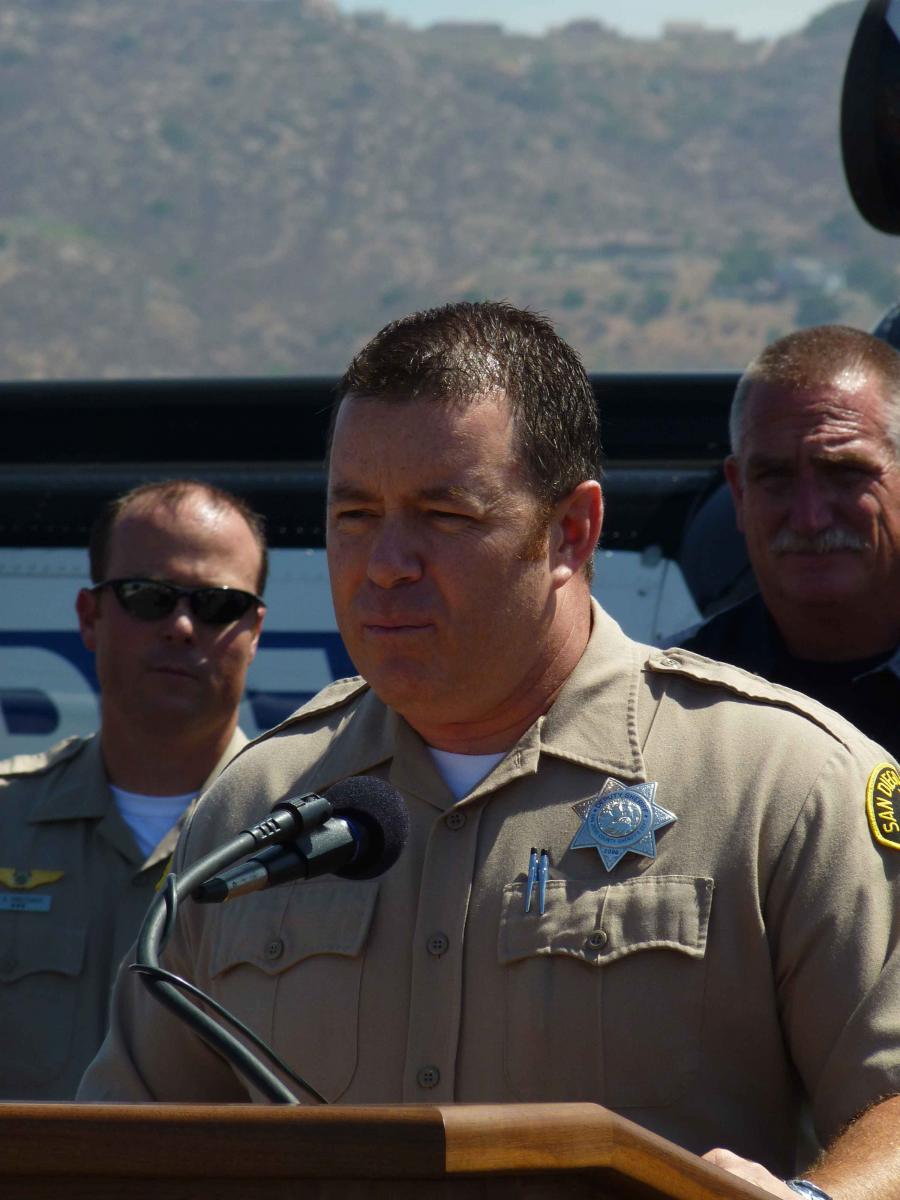 August 26, 2010 (San Diego’s East County) – San Diego Sheriff’s deputies Gary Kneeshaw and Scott Blight saved two rock climbers trapped on the face of El Capitan mountain during the Monte Fire in Lakeside on Saturday. Today, the deputies were honored with a commendation from the County Board of Supervisors for their heroic actions in a daring ASTREA helicopter rescue. In a press conference at Gillespie Field in El Cajon today, Lieutenant Richardson praised the deputies for actions “above and beyond the call of duty” which “without a doubt, saved the lives” of rock climbers André Doria and Meg Rippy.