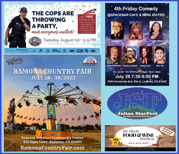 Printer-friendly version By Miriam Raftery July 22, 2023 (San DIego’s East County) — As late July sizzles into hot August nights, there are some hot happenings coming up across San