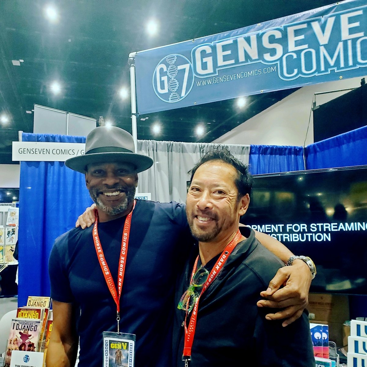 Tucked into all the events were a few celebrity sightings attached to books or comics, such as Jamie Lee Curtis and her book Mother Nature, or former San Diego Charger Sherman Augustus who co-authored with Tim Cogshell and other talent – the Daughters of Django comic book. They manned a booth for Genseven Comics.