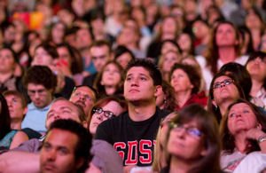 Donning a red SDSU visor, the Dalai Lama opened by saying "When I say brothers and sisters, I truly believe we are the same human being. Now seven billion human beings. Actually, human brothers and sisters. Mentally, emotionally, physically, we are same."
