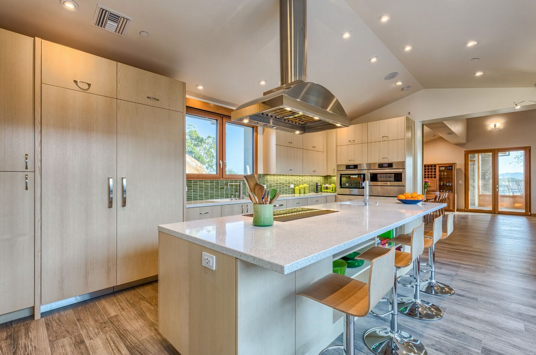 The home also has San Diego County’s first onsite wastewater treatment permit and the first permit to use all collected rainwater for all indoor water use. In addition, it strives for eventual grid-disconnection through utilization of batter power, solar photovoltaic panels, and a 45-foot wind turbine. From controllable lighting to insulated windows, energy-efficient appliances and organic gardens in raised beds, the home is as sustainable as currently possible under existing technology.