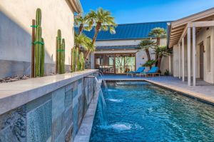 Wellspring’s water system recycles landscaping water and rainwater collected from rooftops through a Wellspring water treatment system. Standing beside a swimming pool on the property’s tiled courtyard, Beck says, “You can drink this pool. It’s potable water.”