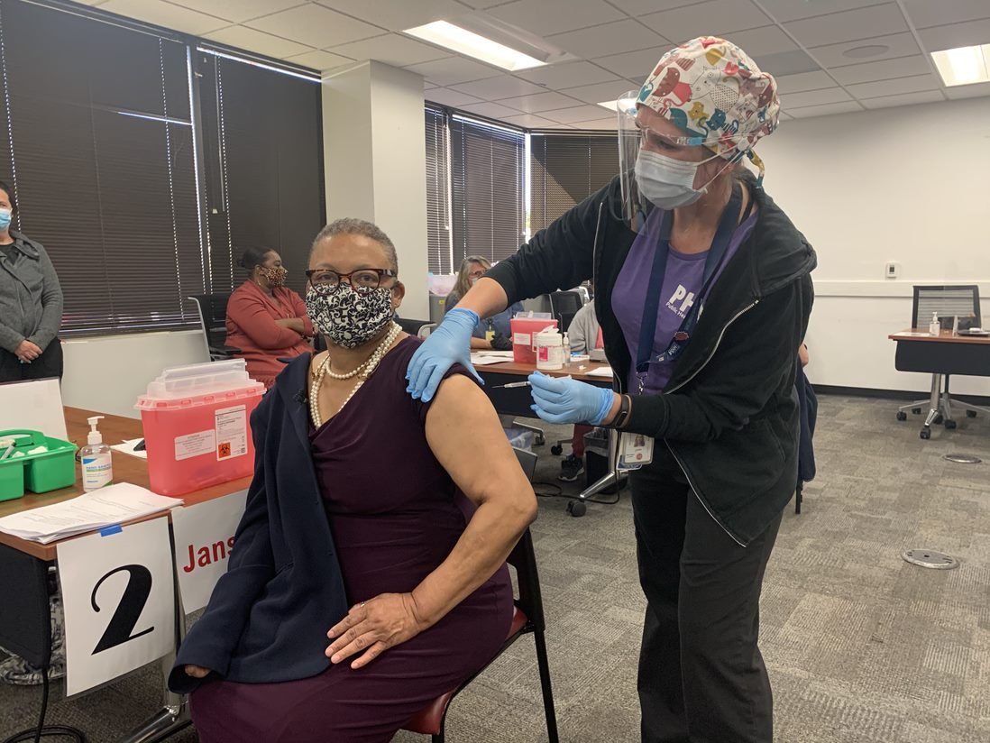 Photo, left: County Public Health Officer Dr. Wilma Wooten receives Johnson and Johnson’s Janssen COVID-19 vaccine.