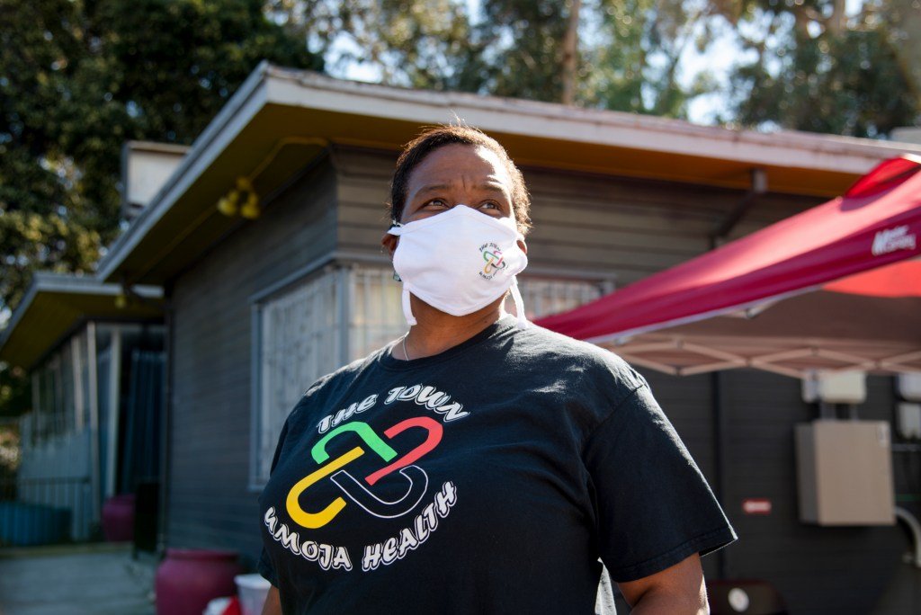Photo, left: Dr. Kim Rhoads has helped set up the Umoja Health pop-up clinic in Oakland to vaccinate Black residents. Photo by Marissa Leshnov for CalMatters