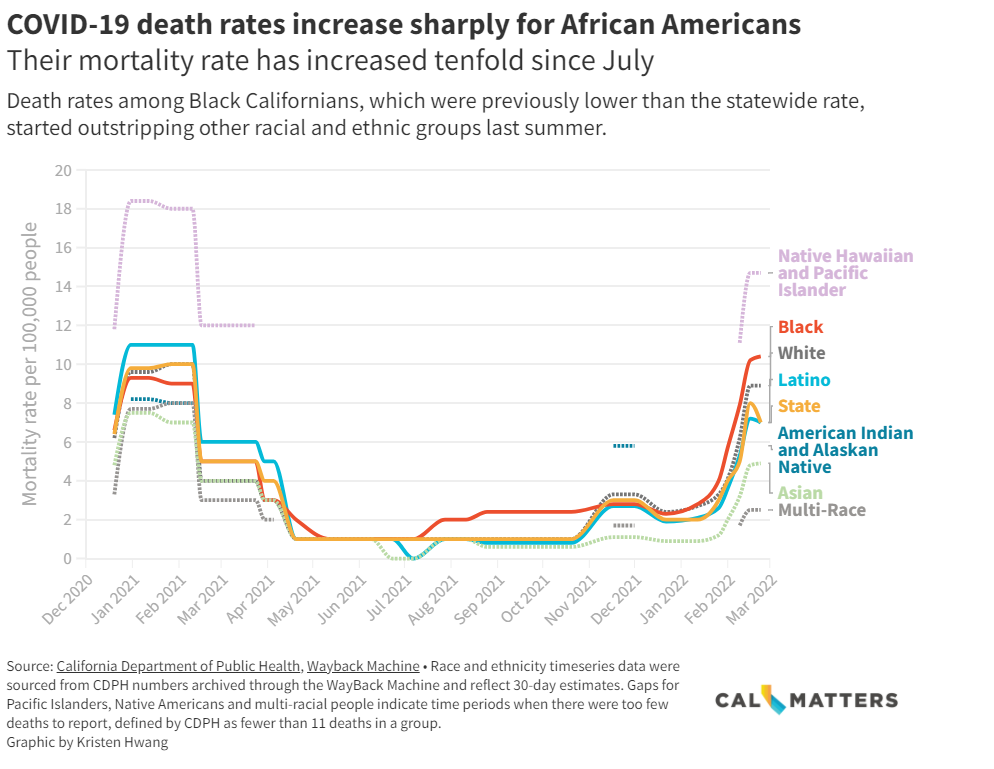A CalMatters analysis shows since last summer, the rate of Black Californians dying from COVID-19 has increased tenfold — from one death per 100,000 people last July to 10.4 deaths this week. That surpasses Latinos and all races except Pacific Islanders, who are dying at the rate of 14.7 per 100,000, according to state data.