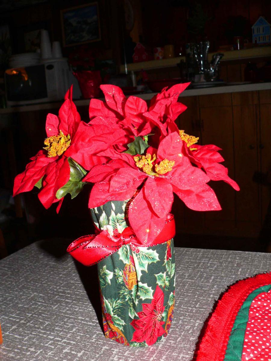 Flip a glass jar or other container upside down and wrap with a circle of fabric. Turn right-side up and tuck fabric into top of glass jar, then glue in place. Add a ribbon and bow to complete your vase for holding a holiday centerpiece or bouquet of poinsettias.