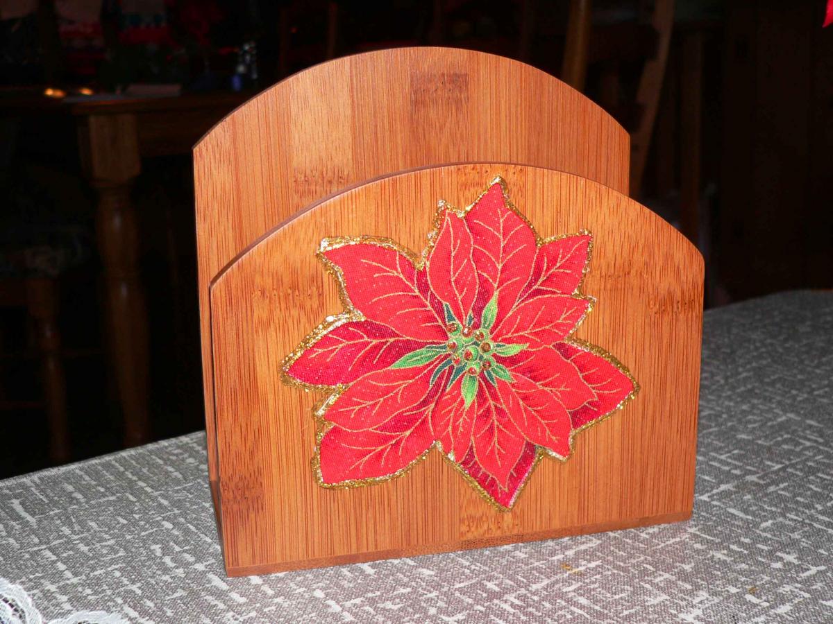 Cut out poinsettias (or whatever items you choose to display) from fabric. Glue onto napkin holder and outline with gold or silver glitter paint for a festive way to display holiday napkins.