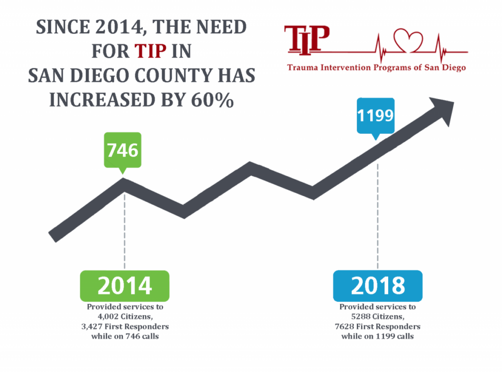 March 19, 2019 (San Diego) — Since 2014,  the volume of crisis team calls received by Trauma Intervention Programs of San Diego (TIP) has risen by 60%.  Last year, TIP responded to 1,199 scenes of tragedy, helping 5,288 residents in our community—and the organization is seeking additional volunteers.