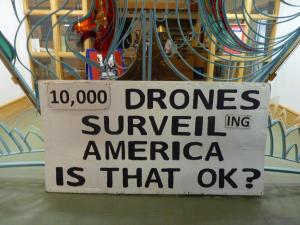 He brought a scale model of a weaponized Predator drone, along with a video screen where guests could view themselves in the crosshairs.  A large sign asked, “10,000 drones surveilling  America – is that okay?”