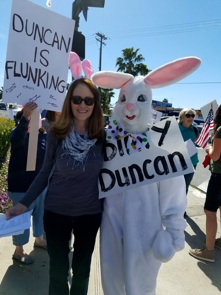 Corruption issues have prompted weekly protests staged by the citizens’ group Indivisible outside Hunter’s El Cajon and Temecula offices, with some constituents carrying “Dirty Duncan” signs and another to dress in a rabbit costume, a reference to Hunter paying for a first-class seat to fly his son’s pet rabbit, using campaign donors’ funds. The next protest in East County is planned on March 21: See: https://www.indivisiblensdc.org/ and https://actionnetwork.org/events/dirty-duncan-protest-in-el-cajon-2