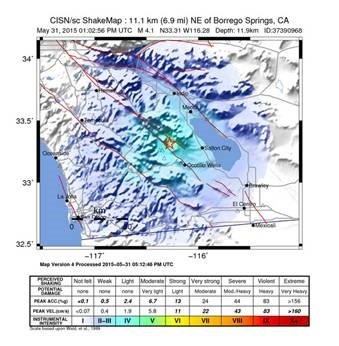 Printer-friendly version East County News Service May 31, 2015 (Borrego Springs)–If you felt the earth move under your feet Sunday morning at 6:02 a.m., that’s because a 4.1 earthquake