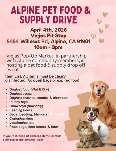 March 14, 2026 (Alpine) – Dog and cat food, treats, grooming supplies, new pet toys, feeding bowls, beds, blankets, crates/carriers, leashes, collars, litter boxes and litter are among the items sought to help pets in need. You can drop off items on April 4 from 10 a.m. to 3 p.m. at the Viejas Pit Stop, 5454 Willows Road in Alpine.