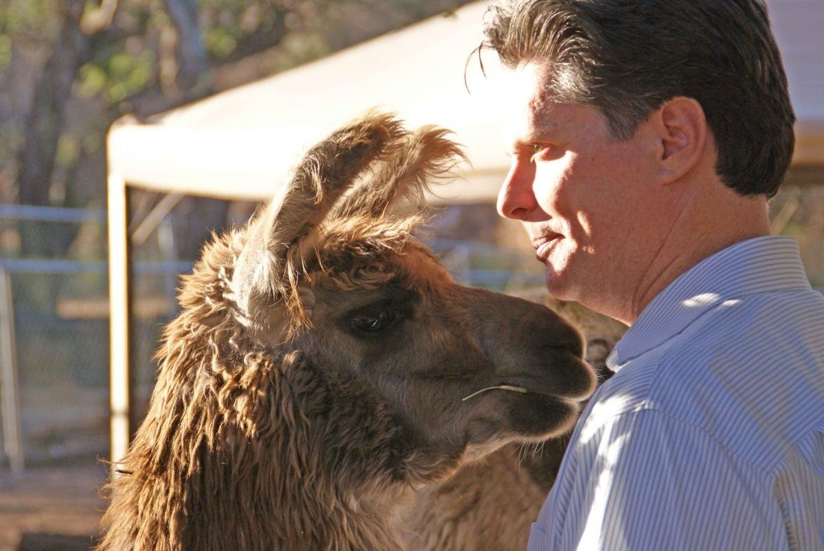 July 27, 2011 (Lyons Valley) – Llama rancher John Klacka knew he had to get help fast when he found his prized stud llama, Muneco, had been bitten by a rattlesnake on July 7. “He was foaming at the mouth and having trouble breathing,” he recalled. “I ran into the house and tried to call the vet—and my phone was dead. I thought `This can’t be happening.’”