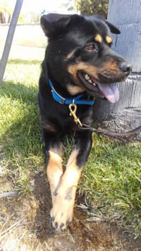 This forty-seven pound, 2 year old spayed female rottweiler mix is a sweet, fun female who bonds extremely closely with her family. Although she is great with other dogs, she would love to be the only dog, and queen of her own castle.