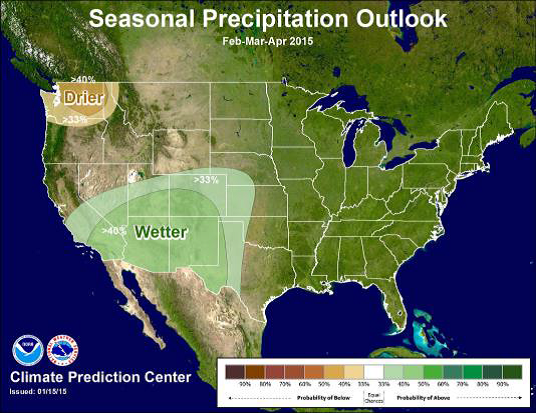 The outlook for this spring, however, is looking – wet! The National Weather Service predicts precipitation 33 to 50 percent above normal for February through April in 2015 according to the forecast data provided by Alex Tardy at the National Weather Service.
