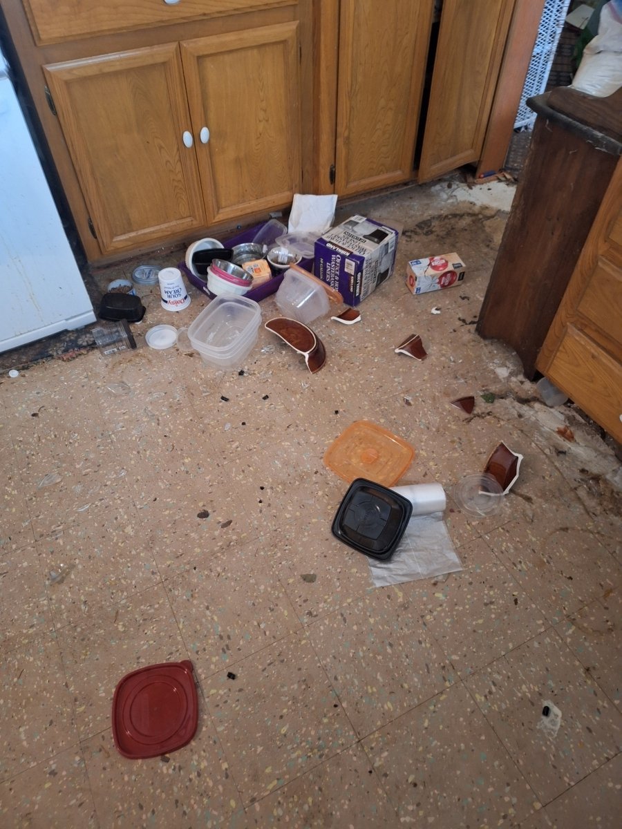 At the San Diego Zoo Safari Park in San Pasqual, elephants formed an “alert circle” during the earthquake, encircling young elephants to protect them.  “Elephants have the ability to feel sound through their feet,” says Emily Senninger with the Safari Park. “This video demonstrates the strong social family structure in elephant herds. The herd, consisting of Ndlula, Umngani, Khosi, and youngsters Zuli and Mkhaya, went back to normal after about 4 minutes, though they did stay close to one another. “ View video.Michele Harvey in Julian sent the photo at left of items spilled onto the floor in her home.